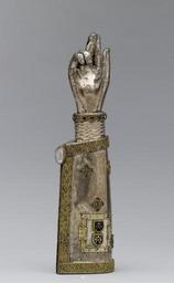 | Keywords: Rhenish - Arm Reliquary of Saint Pantaleon - Walters 57688 - Three Quarter Left.jpg This silver arm is known as a speaking reliquary because it takes shape of the body part it once contained The reliquary reputedly held an arm bone of Saint Pantaleon a Holy Doctor martyred in Asia Minor AD 305 who later became the patron saint of physicians The remains of an inscription along the seam of the sleeve refer to the saint by name The small door with the two glass shields was added in the 15th century as was the crystal at the edge of the sleeve Reliquary late 13th century; Additions 15th century Medieval gilded silver with rock crystal semiprecious stones glass and niello cm 47 2 12 8 9 2 accession number 57 688 25190 A Tollin Paris Chevallier Mannheim Paris May 20 1897 no 79 Robert Hoe New York American Art Association New York February 15 1911 no 1813 Wareham Harding New York Henry Walters city Baltimore Walters Art Museum Henry Walters Acquired by Henry Walters 1920 Transcription Incomplete inscription in niello on the narrow silver strip ornamenting the seam of the sleeve DE SANCTI PANTALEONIS + AVE; Translation From Pantaleon greetings A Medieval Treasury from Southern Collections Ackland Art Center University of North Carolina at Chapel Hill Chapel Hill 1961 Reliquaries and Ritual Medieval Objects of Devotion The Walters Art Gallery Baltimore 1984-1985 Treasures of Heaven The Cleveland Museum of Art Cleveland; The Walters Art Museum Baltimore; The British Museum London 2010-2011 place of origin west Germany Walters Art Museum license Arm Reliquary of Saint Pantaleon |
