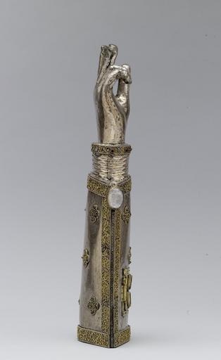| Keywords: Rhenish - Arm Reliquary of Saint Pantaleon - Walters 57688 - Right Side.jpg This silver arm is known as a speaking reliquary because it takes shape of the body part it once contained The reliquary reputedly held an arm bone of Saint Pantaleon a Holy Doctor martyred in Asia Minor AD 305 who later became the patron saint of physicians The remains of an inscription along the seam of the sleeve refer to the saint by name The small door with the two glass shields was added in the 15th century as was the crystal at the edge of the sleeve Reliquary late 13th century; Additions 15th century Medieval gilded silver with rock crystal semiprecious stones glass and niello cm 47 2 12 8 9 2 accession number 57 688 25190 A Tollin Paris Chevallier Mannheim Paris May 20 1897 no 79 Robert Hoe New York American Art Association New York February 15 1911 no 1813 Wareham Harding New York Henry Walters city Baltimore Walters Art Museum Henry Walters Acquired by Henry Walters 1920 Transcription Incomplete inscription in niello on the narrow silver strip ornamenting the seam of the sleeve DE SANCTI PANTALEONIS + AVE; Translation From Pantaleon greetings A Medieval Treasury from Southern Collections Ackland Art Center University of North Carolina at Chapel Hill Chapel Hill 1961 Reliquaries and Ritual Medieval Objects of Devotion The Walters Art Gallery Baltimore 1984-1985 Treasures of Heaven The Cleveland Museum of Art Cleveland; The Walters Art Museum Baltimore; The British Museum London 2010-2011 place of origin west Germany Walters Art Museum license Medieval metalwork in the Walters Art Museum Rhenish paintings Media contributed by the Walters Art Museum needs category review |