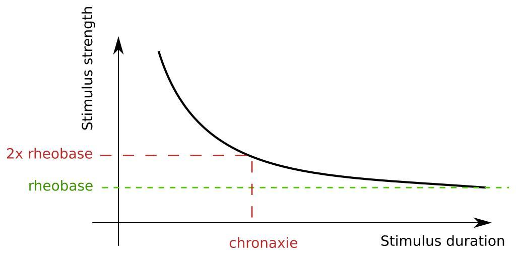 | Keywords: Rheobase chronaxie.svg en Chronaxy is the shortest duration of an electrical stimulus where the threshold amplitude is twice the rheobase - the minimum required for eliciting an ACTION POTENTIAL at any time period It is a measure of the excitability of nerve or muscle tissue and is characteristic of types and/or condition of the nerve or muscle cells in the tissue <br /> Rheobase is the minimal current amplitude of indefinite duration practically a few hundred milliseconds that results in the depolarization threshold of the cell membranes being reached i e an action potential or the contraction of a muscle 2012-09-23 22 33 18 own https //commons wikimedia org/wiki/File Rheobase_chronaxie png Sav vas cc-zero Uploaded with UploadWizard Psychiatry Psychology SVG files on nervous system |