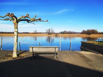 Keywords: rhine bench plane recovery rest idyllic water mirroring sky ried landscape gottlieben thurgau switzerland