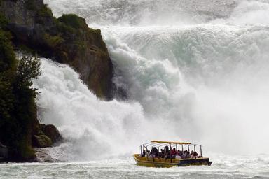 Keywords: rhine falls schaffhausen excursion boat visit water wall waterfall rock cliffs island switzerland rhine water foaming water masses river murmur roaring spray wave undaunted elements current foolhardy rapids boot ship tourism