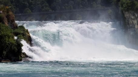 Keywords: rhine falls schaffhausen water spray enormous switzerland germany rhine river tourism destination murmur roaring water mass rock observation deck