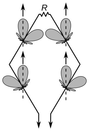 Keywords: Rhombic antenna diagram.svg rhombic antenna showing how it works The rhombic antenna is a directional wire antenna used on MF and HF bands for shortwave reception The antenna consists of a wire suspended above the ground in the shape of a rhombus terminated at one end by a resistor equal the the wire's characteristic impedance about 400 to 600 ohms and at the other end connected to the feedline to the receiver The rhombic is a travelling wave antenna Each segment of the rhombus has a radiation pattern as shown grey having two lobes pointed forward at a certain angle By making the corner angle equal to twice the tilt angle the main lobes of each of the 4 sides point in the same direction and reinforce each other increasing the gain 2015-03-30 own Chetvorno other versions cc-zero Uploaded with UploadWizard Rhombic antennas |