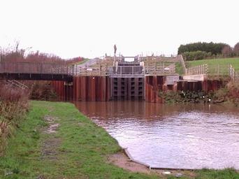 | Keywords: Ribble Link 04c232.jpg The three-chambered staircase of locks on the Ribble Link at SD 509 311 in Ingol north west of Preston Lancashire England This staircase brings the canal down from the Lancaster Canal to the Savick Brook The wide pond in the foreground is necessary because boats on emerging from the bottom chamber have to execute a very tight turn to continue their journey under the bridge in the left of the picture Gazing down into the top chamber is a larger than lifesize wooden statue of a man labelled Gauging the Ripple 4 Water by Thompson Dagnall Commissioned by The Waterways Trust and British Waterways This is one of a number of statues beside this new cut Photo taken 2004 December 28 13 18 RHaworth Ribble Link Images by Roger W Haworth |