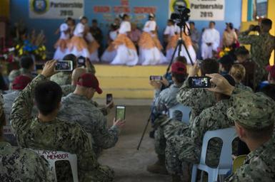 | Keywords: Ribbon cutting ceremony at Basiao Elementary School in the Philippines during Pacific Partnership 2015 150801-N-UQ938-209.jpg en BASIAO Philippines Aug 1 2015 U S Navy Seabees and U S Air Force RED HORSE engineers from the hospital ship USNS Mercy T-AH 19 record a dance performance by students at Basiao Elementary School The engineers spent two weeks with the students while rebuilding parts of the school that had been damaged in Hurricane Yolanda Mercy is in the Philippines for its third mission port of Pacific Partnership 2015 Pacific Partnership is in its 10th iteration and is the largest annual multilateral humanitarian assistance and disaster relief preparedness mission conducted in the Indo-Asia-Pacific region While training for crisis conditions Pacific Partnership missions to date have provided real world medical care to approximately 270 000 patients and veterinary services to more than 38 000 animals Critical infrastructure development has been supported in host nations during more than 180 engineering projects U S Navy photo by Mass Communication Specialist 1st Class Trevor Andersen/RELEASED <br>Unit Navy Public Affairs Support Element West 2015-08-01 Petty Officer 1st Class trevor andersen https //www dvidshub net/image/2099765/ribbon-cutting-ceremony-basiao-elementary-school-philippines-during-pacific-partnership-2015 150801-N-UQ938-209 2015-08-01 17 42 BASIAO PH PD-USGov-Military-Navy USNS Mercy T-AH-19 Pacific Partnership 2015 United States Navy Seabees Images from DoD uploaded by Fæ |