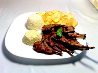 Keywords: ribs potato chips food beef red vegetable spices spicy ribbed grill barbecue plate bbq bbq ribs delicious
