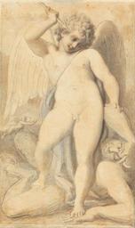 | Keywords: Richard Cosway - Cupid Overpowering a Satyr - Google Art Project.jpg Google Art Project watercolor Devon 1742 London 1821 Richard male 2320990 Cosway British 1742 - 1821 /collection/yale-center-for-british-art/artwork/cupid-overpowering-a-satyr-richard-cosway/2441862/ Richard Cosway Artist /artist/richard-cosway/4129605/ 4129605 /collection/yale-center-for-british-art/ Yale Center for British Art 2305845 http //britishart yale edu/ 2/24/2012 12 19 36 AM /collection/yale-center-for-british-art/artwork/cupid-overpowering-a-satyr-richard-cosway/2441862/ 1757 undated satyr Cupid angels hooves animal components mythology cherubs putti men arrows wings costume accessories quivers historical subject Watercolor and graphite on thin smooth cream wove paper 368 2441862 False 1821 3/24/2012 10 14 16 PM YCBA/lido-TMS-7090 http //collections britishart yale edu/vufind/Record/1670821 Yale Center for British Art Gift of Mr and Mrs Stuart P Feld painting 1750 1830 Devon Creation w283 x h368 cm undated False 0 591796875 Item cupid-overpowering-a-satyr-richard-cosway Cupid Overpowering a Satyr c 283 Inscribed in graphite on mount upper left < 18/> ; in graphite upper right 33 in graphite lower right 66 ; inscribed in graphite verso lower left G A ; in graphite lower left 4962 Inscription _Marks Watermark on mount J Whatman Inscription _Signed_and_Dated Signed in graphite verso lower right Richard Cosway Allegorical Scene Not on View Watercolor and graphite on thin smooth cream wove paper satyr Cupid angels hooves animal components mythology cherubs putti men arrows wings costume accessories quivers historical subject special url_id gQExOT0NaaLy2g PD-old-100-1923 1821 Richard Cosway Google Art Project works by Richard Cosway Putti with animals |
