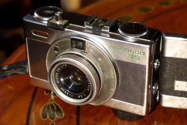 | Keywords: camera vintage electronics lens indoor - Fixed focal length 35 mm. - Manual focus. - Shutter speed 1/30 - 1/300". - Aperture f/2.8 - 22 - auto (shutter prio) by means of cadmium sulphide photo detector servo. - When external flash is used on hot shoe, manual aperture must be calculated from formula = flash grade / distance. - Viewfinder with 0.33x magnification, visible focus setting and dot that changes color when exposure is enough, depending on selected film ISO (ISO was still called ASA). - 35 mm film, ISO 25 - 400, spring operated. - Steel body. - Made in Japan. - Fixed focal length 35 mm. - Manual focus. - Shutter speed 1/30 - 1/300". - Aperture f/2.8 - 22 - auto (shutter prio) by means of cadmium sulphide photo detector servo. - When external flash is used on hot shoe, manual aperture must be calculated from formula = flash grade / distance. - Viewfinder with 0.33x magnification, visible focus setting and dot that changes color when exposure is enough, depending on selected film ISO (ISO was still called ASA). - 35 mm film, ISO 25 - 400, spring operated. - Steel body. - Made in Japan. |