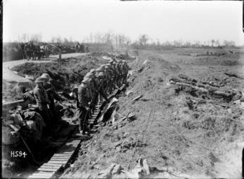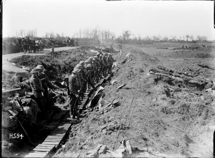 | Keywords: blackandwhite monochrome outdoor snow black and white Soldiers stand along a duckboard walk ready for rifle inspection near Colincamps, France, where New Zealand support lines were established in World War I. Photograph taken 15 April 1918 by Henry Armytage Sanders. Inscriptions: Inscribed - Photographer's title on negative -bottom left: H594. Quantity: 1 b&w original negative(s). Physical Description: Dry plate glass negative 4 x 5 inches Rifle inspection in the New Zealand support line, France. Royal New Zealand Returned and Services' Association :New Zealand official negatives, World War 1914-1918. Ref: 1/2-013203-G. Alexander Turnbull Library, Wellington, New Zealand. natlib.govt.nz/records/22677821 Soldiers stand along a duckboard walk ready for rifle inspection near Colincamps, France, where New Zealand support lines were established in World War I. Photograph taken 15 April 1918 by Henry Armytage Sanders. Inscriptions: Inscribed - Photographer's title on negative -bottom left: H594. Quantity: 1 b&w original negative(s). Physical Description: Dry plate glass negative 4 x 5 inches Rifle inspection in the New Zealand support line, France. Royal New Zealand Returned and Services' Association :New Zealand official negatives, World War 1914-1918. Ref: 1/2-013203-G. Alexander Turnbull Library, Wellington, New Zealand. natlib.govt.nz/records/22677821 |