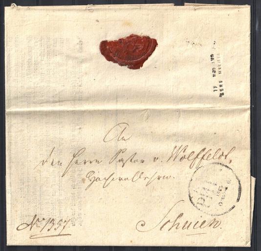 Keywords: Riga 1833 Dob40204.jpg en Russian Latvia stampless folded free-frank church letter to Wenden Lifland 'Рига October 9 ' large circular cancel Boxed arrival backstamp 'венден 1833 ОКТОБРЯ 11' Details Official church letters were free of postage dues October 9 Julian 1833 letter posted at Riga 'RIGA October 9 1833' postmark applied; Dobin 40 type 2 04 used from 1827-1830 late usage thus Rarity 4 October 11 Wenden arrival backstamp Dobin 40 2 04 type 1 05 used from 1833-1838 reception postmark for official mail Rarity 3 1833 Scan of original Postal authorities PD-old-100 Stampless covers of Russia Stampless covers of Latvia Postal history 1833 postmarks |