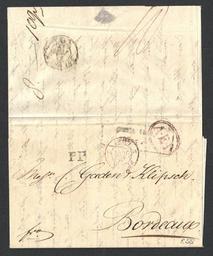 | Keywords: Riga 1843 Dob40112.jpg en Russian Latvia stampless folded paid letter to France 'Рига юнь 5' RIGA June 5 boxed cancel handstamp 'PP' manuscript '10' decimes rate fr 1 00 used for letters under 7 5 grams brown-red oval 'A E D' brown-red 'PRUSSE/3/GIVET 28 JUIN 43' arrival backstamp 'Bordeaux' Details French rates in 1843 Under 7 5 grams - 1 00 fr June 5 Julian 1843 paid letter posted at Riga Sender wrote 'fro' indicating franco The under 7 5 grams was assessed expressed as 10 decimes and manuscript '10' applied Restated by handstamp 'PP' equivalent to Postage Paid to destination 'RIGA June 5 1843' postmark applied; Dobin 40 type 1 12 Transit postmark for foreign mail used from 1833-1845 Rarity 3 June 28 Gregorian French entry mark mail from Prussia Prusse entering France at the border town of Givet The small 3's show this mark was struck at Paris Also marked by the French exchange bureau 'A E D ' meaning Affranchissement a l'étranger jusqu'à destination foreign rate paid to destination ; Bordeaux arrival backstamp 1843 Scan of original Postal authorities PD-old-100 Stampless covers of Russia Stampless covers of Latvia Postal history Marque d'entrée en France 1843 postmarks |