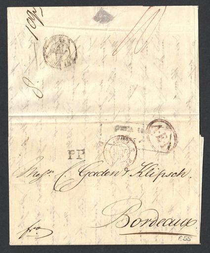 Keywords: Riga 1843 Dob40112.jpg en Russian Latvia stampless folded paid letter to France 'Рига юнь 5' RIGA June 5 boxed cancel handstamp 'PP' manuscript '10' decimes rate fr 1 00 used for letters under 7 5 grams brown-red oval 'A E D' brown-red 'PRUSSE/3/GIVET 28 JUIN 43' arrival backstamp 'Bordeaux' Details French rates in 1843 Under 7 5 grams - 1 00 fr June 5 Julian 1843 paid letter posted at Riga Sender wrote 'fro' indicating franco The under 7 5 grams was assessed expressed as 10 decimes and manuscript '10' applied Restated by handstamp 'PP' equivalent to Postage Paid to destination 'RIGA June 5 1843' postmark applied; Dobin 40 type 1 12 Transit postmark for foreign mail used from 1833-1845 Rarity 3 June 28 Gregorian French entry mark mail from Prussia Prusse entering France at the border town of Givet The small 3's show this mark was struck at Paris Also marked by the French exchange bureau 'A E D ' meaning Affranchissement a l'étranger jusqu'à destination foreign rate paid to destination ; Bordeaux arrival backstamp 1843 Scan of original Postal authorities PD-old-100 Stampless covers of Russia Stampless covers of Latvia Postal history Marque d'entrée en France 1843 postmarks |