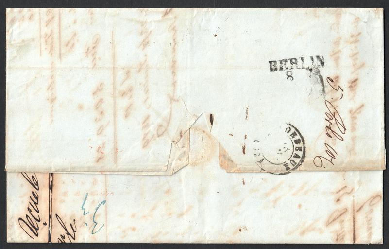 Keywords: Riga 1849 Dob40118 reverse.jpg en Russian Latvia reverse of stampless folded unpaid letter to France 'Рига 22 юнь 1849' RIGA June 22 1849 cancel handstamp 'AUS RUSSLAND' 'PRUSSE/3/VALENCIENNES 11 JUIL 49' manuscript '40' decimes rate Reverse BERLIN/8 7 transit arrival backstamp 'Bordeaux' Details June 22 Julian or July 4 Gregorian 1849 unpaid letter posted at Riga The weight was assessed expressed as 40 decimes and manuscript '40' applied Reverse restated by manuscript '5 Porto 10' 'RIGA June 22 1849' postmark applied; Dobin 40 type 1 18 Transit postmark for foreign mail used from 1848-1850 July 8 Gregorian 'BERLIN 8 7' typical Berlin transit postmark and 'AUS RUSSLAND FRANCO' applied Based on the usual presence of these Berlin postmarks this 'AUS RUSSLAND FRANCO' marking is regarded as a Berlin mark White Aus Russland type B4 found from 1844-January 1846 mail coach period and from early 1848 to October 1849 railroad period July 11 Gregorian French entry mark mail from Prussia Prusse entering France at Valenciennes The small 3's show this mark was struck at Paris July 13 32 Bordeaux arrival backstamp Recipient had to pay 40 decimes for the letter 1849-07-04 own scan Post of Russia other versions See more images Riga 1849 Dob40118 01 jpg Riga 1849 Dob40118 reverse jpg Riga 1849 Dob40118 content jpg LangSwitch Russian Latvia 1849 stampless folded unpaid letter to France Custom license marker 2016 05 23 PD-old-100 Stampless covers of Russia Covers of Russia 1849 Stampless covers of Latvia 1849 in the Russian Empire Entry and transit postmarks of Germany Postmarks of Berlin 1849 postmarks |