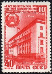| Keywords: Riga 1950 40kop USSR.jpg en Postage stamp issued by the Soviet Union 1950 depicting view of Riga Latvia Scan of postage stamp from own collection Philaweb 2009-11-14 PD-RU-exempt stamps Stamps of the Soviet Union 1950 Riga on stamps Latvian Soviet Socialist Republic Coats of arms of Latvian SSR |