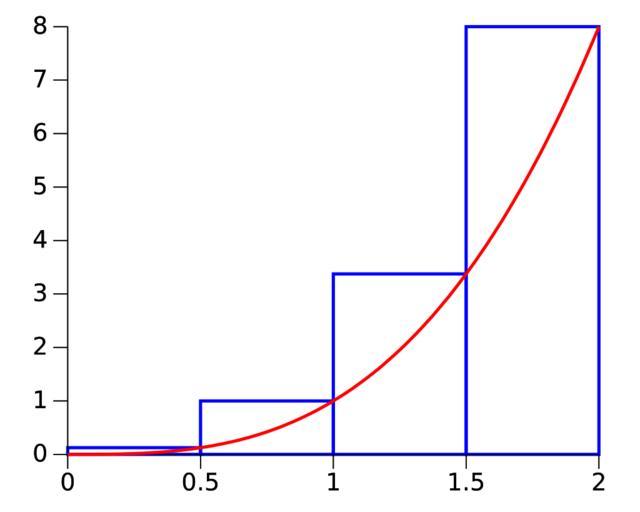 | Keywords: RightRiemann2.svg en A right Riemann sum of x 3 over 0 2 using 4 subdivisions Own Qef 2009-06-21 Shows same thing as this bitmap version file RightRiemann2 PNG Gnuplot source <pre> set terminal svg font Bitstream Vera Sans 18 set output RightRiemann2 svg set xrange 0 2 set yrange 0 8 set xzeroaxis linetype -1 set yzeroaxis linetype -1 set xtics axis nomirror offset 0 0 5 set ytics axis nomirror offset -0 5 0 set key off set border 0 set samples 100 plot '-' with boxes fill linetype rgbcolor blue linewidth 3 0 25 0 125 0 75 1 1 25 3 375 1 75 8 e plot x x x with line linetype rgbcolor red linewidth 3 </pre> Qef Riemann integral Images with Gnuplot source code |