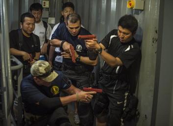 | Keywords: RIMPAC 2014 VBSS training 140702-N-PX130-121.jpg  en Japan Maritime Self Defense Force sailors from JS Kirishima DDG 174 and JS Ise DDH 182 practice Visit Board Search and Seizure techniques with instructors from the Center for Security Forces Detachment Pearl Harbor during Rim of the Pacific RIMPAC Exercise 2014 The world's largest international maritime exercise RIMPAC provides a unique training opportunity that helps participants foster and sustain the cooperative relationships that are critical to ensuring the safety of sea lanes and security on the world's oceans Twenty-two nations more than 49 ships six submarines more than 200 aircraft and 25 000 personnel are participating in RIMPAC U S Navy photo by Mass Communication Specialist 1st Class Daniel Gay/Released 2014-07-02 Petty Officer 1st Class Daniel Gay https //www dvidshub net/image/1434327 140702-N-PX130-121 2014-07-03 23 44 FORD ISLAND HI US PD-USGov-Military-Navy JS Ise DDH-182 RIMPAC 2014 Images from DoD uploaded by Fæ |
