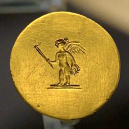 | Keywords: Ring Eros torch-bearer CdM InvMonOr497.jpg Gold ring with round bezel representing a torch-bearer Eros 4th century BC Éros portant une torche Bague en or à chaton rond gravé en intaille IVe siècle av J -C Museum Cabinet des Médailles Upper floor smaller room object history credit line accession number Inv Mon Or 497 Chab 2630 Marie-Lan Nguyen User Jastrow 2008-04-13 other versions Coins in the Cabinet des médailles Paris Eros in jewellery Ancient Greek jewellery in France Finger rings | ||||