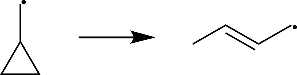 Keywords: Ring Opening.svg en Ring opening example in which cyclopropylmethyl undergoes a very rapid ring opening rearrangement which would relieve the ring strain and is enthalpically favorable Own Harbin 2009-09-06 Chemical kinetics
