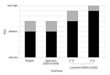 | Keywords: Risks associated with wildfires in North America due to climate variability and change.png climate change will increase risks associated with wildfires in North America The graph legend is available as a separate image Risks are shown for the present 2014 near-term 2030 to 2040 and long-term 2080 to 2100 Long-term risks are shown for 2 and 4 °C of global warming relative to pre-industrial times The top of the grey bar shows the risk level based on current adaptation practices to climate variability and change The top of the black bar shows the risk level based on a hypothesized highly adapted state Graph data is available in a later section References Assessment Box SPM 2 Table 1 in http //www ipcc ch/pdf/assessment-report/ar5/wg2/ar5_wgII_spm_en pdf Summary for Policymakers archived http //web archive org/web/20141102140028/http //ipcc ch/pdf/assessment-report/ar5/wg2/ar5_wgII_spm_en pdf 2 November 2014 p 23 in citation 2014 IPCC AR5 WG2 A CITEREFIPCC AR5 WG2 A2013 Field C B et al Climate Change 2014 Impacts Adaptation and Vulnerability Part A Global and Sectoral Aspects GSA Contribution of Working Group II WG2 to the Fifth Assessment Report AR5 of the Intergovernmental Panel on Climate Change IPCC http //www ipcc ch/report/ar5/wg2/ Cambridge University Press harv Archived http //web archive org/web/20141102140028/http //ipcc ch/report/ar5/wg2/ 2 November 2014 2014-11-10 08 53 52 own Enescot other versions Data Risk levels Very low 0 Medium 50 Very high 100 wikitable - Timeframe Adaptation - Current High - Present 70 50 - 2030 to 2040 70 50 - 2 degrees C 90 70 - 4 degrees C 100 90 - cc-zero Uploaded with UploadWizard Global warming graphs |