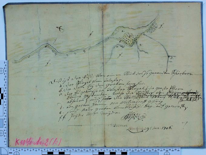 | Keywords: Riss des Schierbaum 9088.jpg  Die Bilder enstanden anläßlich eines Workshops im Rahmen von Skillshare 2010 in Zusammenarbeit mit dem Stadtarchiv Lüneburg Die Originale wurden freundlicherweise vom Stadtarchiv zur Verfügung gestellt  <br /> Transkript der Bildbeschreibung <blockquote> Diß ist der Riß von einem Stück des so genandten Schierborn<br /> a der Spiegel vom Waßer<br /> b der Dam bey dem Graben lang hier<br /> c der Zugewachsene Waßer Spiegel da große Ellern Bäume gestanden welche der Schuster von abhauen und jetz die Stämme /Einfügung durch da dorff welchen er solchen graf zu sche hat/ aus ten laßen <br /> d Ein Garten Zaun von Miltendorff gehörig <br /> e sind neue Graben von von st zu agen aufgeworffen <br /> f f Jegde und Weide <br /> W Häßler<br /> Lüneburg d 29ten Jan 1746 <br /> </blockquote> Registratur K10 H2 k own 2010-06-09 user Joergens mi 53 2459671 10 4084140 PD-old Skillshare 2010 Stadtarchiv Stadtarchiv Lüneburg De Wikisource book leaflet Joergens mi Manuscripts Lüneburg in the 1740s 1746 documents Taken with Pentax K20D Jömi 201010 |