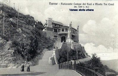 Keywords: Il Ristorante Campo dei Fiori (arch. Giuseppe Sommaruga, 1910) visto dalla stazione a monte della funicolare. In alto a sinistra le tre croci. varese campodeifiori