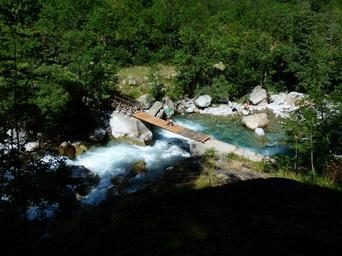 Keywords: river bach mountain stream bridge wooden bridge cross valley forest stones cold clear refreshment hiking wanderer run dangerous beautiful idyllic italy clean vallone della barra bubble torrent piedmont gesso della barra