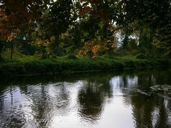 Keywords: river bank waters water reflection mirroring savage overgrown plant autumn trees tree landscape nature