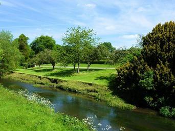 Keywords: river green path trees lawn nature outdoor scenery sky stream