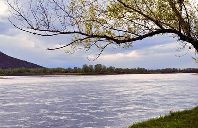 Keywords: river landscape storm clouds sky grass tree leaves twigs summer green