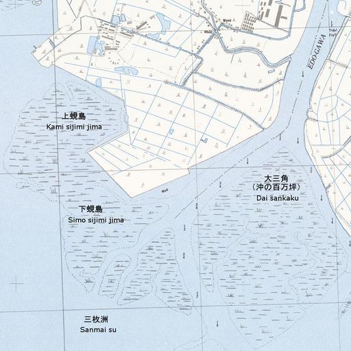 | Keywords: River mouth of old edogawa in 1945.jpg en This map shows the river mouth of old Edogawa between Tokyo and Chiba prefecture in 1945 Dai sankaku Kami sijimi jima Simo sijimi jima had been filled since 1972 ja 1945年頃の旧江戸 の河口を示した図 大三角 上 島 下 島は1972年頃に埋め立てられた txu-oclc-6549645-13 jpg ams/japan_city_plans/ US army Nagasima Sakon 2010-03-21 PD-USGov Maps of the history of Japan | ||||