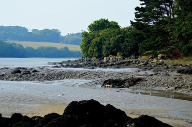 Keywords: river pebbles rock shore water field tree landscape nature finistère brittany france
