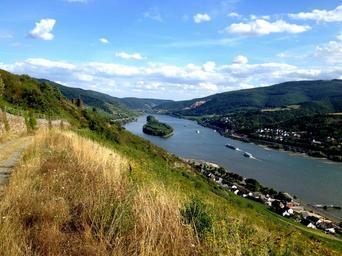 Keywords: river rhein panorama landscape sky blue clouds hills mountains view riverside settlements houses germany