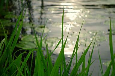 Keywords: river riverbank rushes water's edge water sunlight on water bokeh