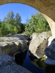 Keywords: river rocks bridge arc reflection landscape