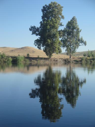 Keywords: river shore trees reflection nature grassland eucalyptus water hills symmetry peaceful heat zújar bell tower blue sky june
