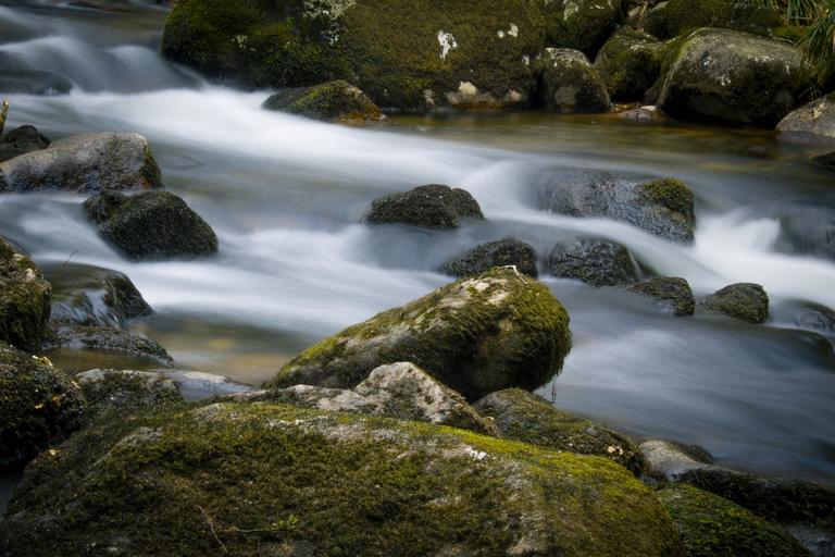 Keywords: river slow exposure woodland moss water forest stream motion long blur plant stone rock landscape nature movement waterway woods green