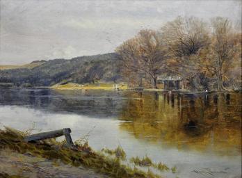 | Keywords: River Thames, above Pangbourne Berkshire.jpg en River Thames above Pangbourne Berkshire Signed bas droite titled verso Oil on Canvas 54cm x 42cm before 1934 http //www bigskyfineart com/a/pennell-harry/river-thames-above-pangbourne-berkshire Harry Pennell Custom license marker 2013 02 05 PD-Art Uploaded with UploadWizard Harry Pennell River Thames at Pangbourne Paintings of the Thames Pangbourne Berkshire in art | ||||