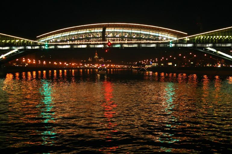 Keywords: river water cruise bridge lights white reflection red green orange repetition pattern bright glow sheen symmetry night