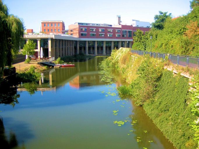 Keywords: river water nature landscape grass green relaxation bush wide stilt house restaurant leipzig