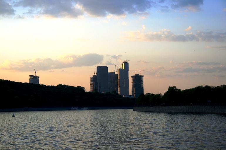 Keywords: river water wide embankments centre focus international business centre buildings clump modern tall sky