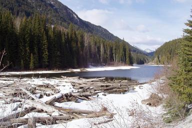 Keywords: river winter season nature scenery landscape water trees stacked logs british columbia canada