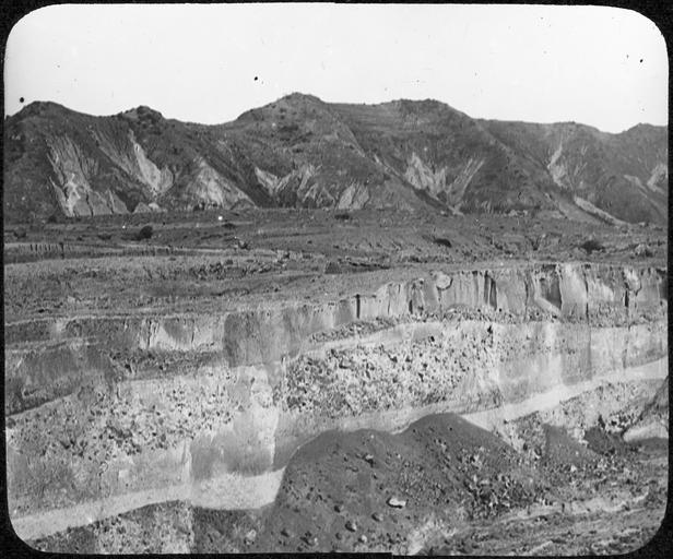 Keywords: Riviere Blanche YORYM-TA0315.jpg One slide and one negative Gorge cut in thick ash deposits of 1902 eruption The top of the ash deposits is almost level Several ash units are present in the walls of the gorge - some relatively fine-grained and others with concentrations of large blocks They may represent ash flows and/or mud flows Screes have formed at the base of the cliffs Some vegetation on the hills in the background depicted people depicted place Rivière Blanche Martinique 1907 Black and White glass Lantern slide Institution Yorkshire Museum Natural History object history exhibition history credit line Yorkshire Museum York Museums Trust accession number YORYM TA315 The Tempest Anderson Photographic Archive held at York Museums Trust <br> York Museums Trust image PD-old-100 PD-US Uploaded with UploadWizard Images from the Tempest Anderson Collection vulcanology 1902 eruption of Mount Pelée Volcanic ash 1907 photographs
