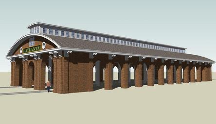 | Keywords: RKO backlot Atlanta railway depot from Gone With The Wind.jpg Other views <gallery> Image RKO backlot Atlanta railroad depot from Gone With The Wind - alt angle jpg </gallery> 2D image exported from a 3D model of a variant of a movie set exterior that once existed until 1976 on the now demolished RKO Studios Forty Acres backlot in Culver City California The model depicts the Atlanta railroad depot as it appeared in the 1939 cinema classic <i>Gone with the Wind</i> The set as constructed was a slightly downsized version as is the 3D model of the actual depot and it was featured prominently in scenes that dramatized events leading to the fall of Atlanta in that film The backlot movie set was an incomplete structure with roofing only on the side which was filmed and with a painted facade simulating the windowed structure along the roofline self-made in Google Sketchup 6 0 2008-05 Kipp Teague Film sets RKO Studios Architectural drawings by SketchUp Gone with the Wind film |