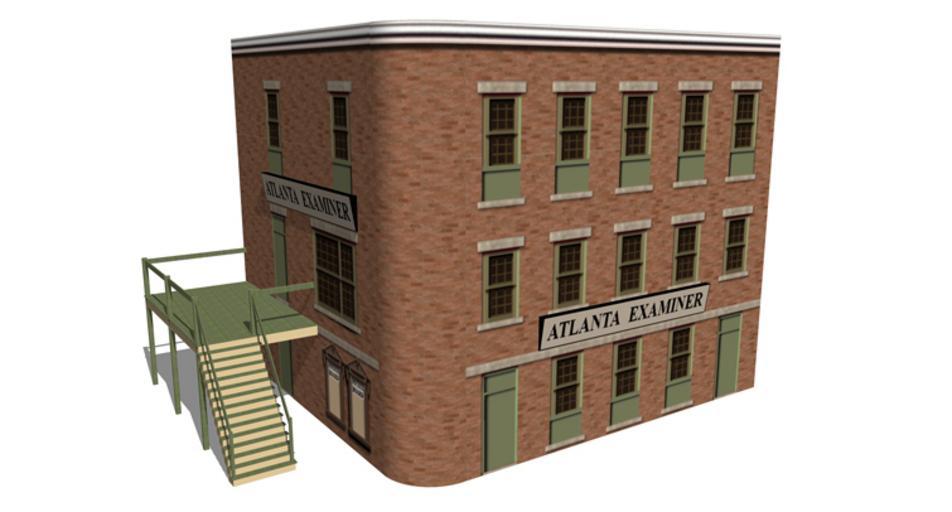 Keywords: RKO backlot building.jpg 2D image exported from a 3D model of a building that once existed until 1976 on the now demolished RKO Studios backlot called Forty Acres The building was used as a film set and appeared in the 1939 cinema classic Gone with the Wind as the Atlanta Examiner a fictitious news office that posted in a scene from the film the list of Confederate Army soldiers that were confirmed dead following the battle at Gettysburg self made designed in Google Sketchup 6 0 2008-02 Bill Wrigley Film sets RKO Studios Architectural drawings by SketchUp Architectural 3D drawings CAAD |