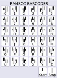| Keywords: Rm4scc.svg RM4SCC barcode elements own original text Own work based on literature published by Royal Mail Group plc This information is in the public domain and hence ineligible for copyright 1 2007-07-19 Sakurambo wikipedia en Sakurambo en Original upload log page en wikipedia Rm4scc svg 2007-07-19 11 29 Sakurambo 232×428× 19328 bytes <nowiki>RM4SCC barcode elements Own work based on literature published by Royal Mail Group plc This information is in the public domain and hence inelegible for copyright </nowiki> Four-state barcodes |