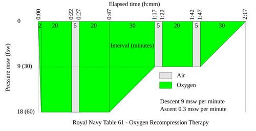 Keywords: RN Table 61.svg en Graphic representation of Royal Navy Table 61 - Oxygen Recompression Therapy 2016-03-30 own Peter Southwood other versions cc-zero Decompression tables