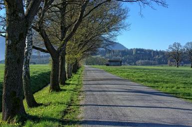 Keywords: road away trees avenue nature wide distant spring landscape bavaria chiemgau holiday recovery meadow green pasture