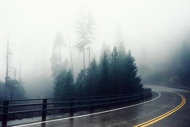 Keywords: road curve wet rainy forest fog misty nature travel landscape lane journey winding railing guard rail foggy trees hill