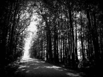 Keywords: road gray street black way travel woods trees journey horizon spooky swamp forest
