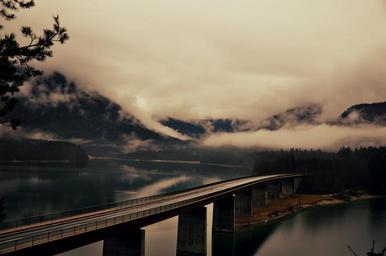 Keywords: road lake bridge sylvensteinspeicher gloomy landscape autumn nature mirroring crossing malerwinkel fog bavaria